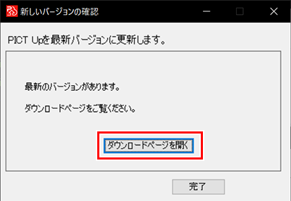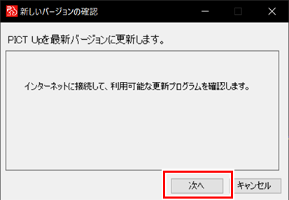- [スタート]メニューから[すべてのアプリ] - [PICT Up] - [新しいバージョンの確認]をクリックします。