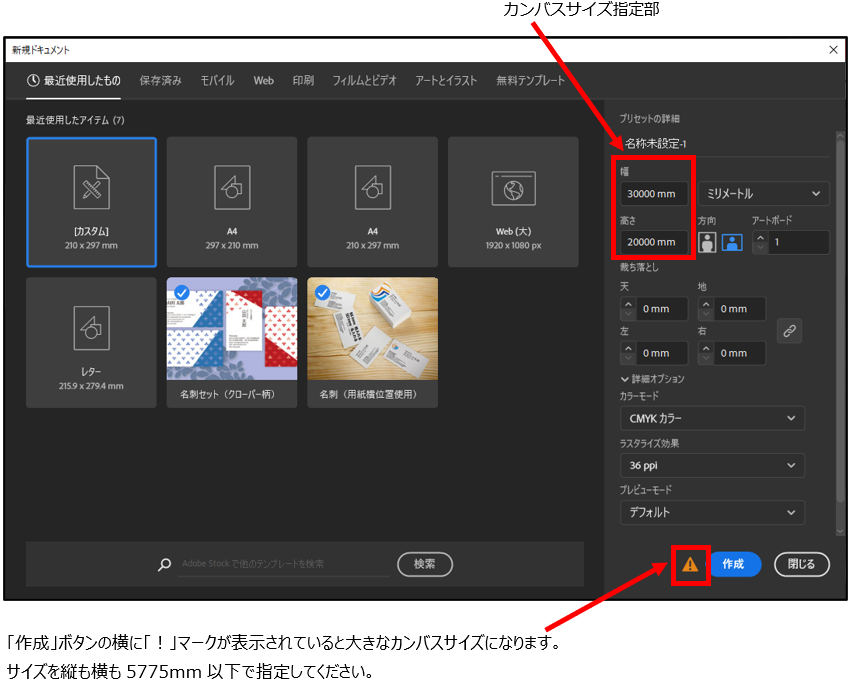 縦横ともに5775mm以下のカンバスサイズで新規ドキュメントを作成する必要がありますので、